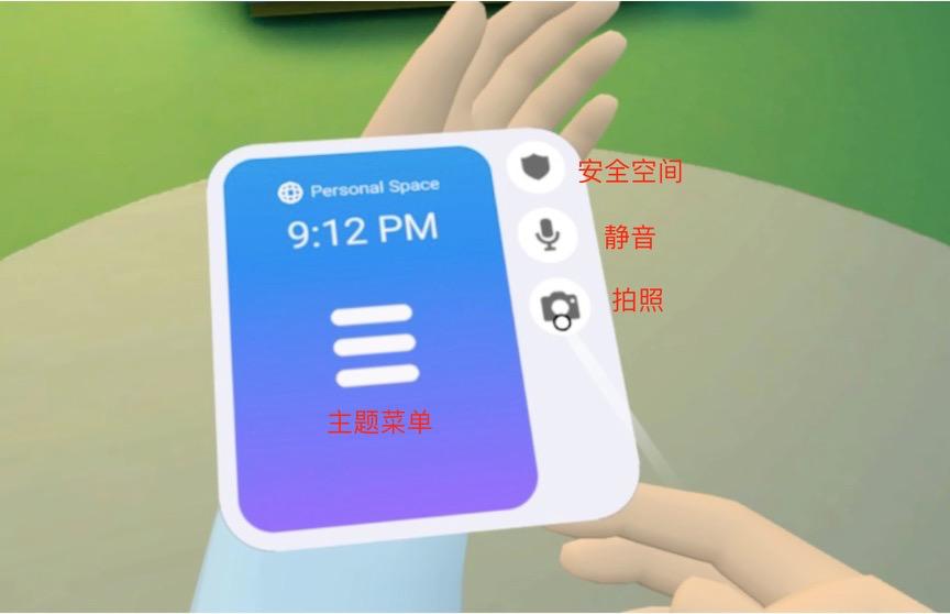 之后,有一个女声语音导览会引导你的每一步操作,以及解释Horizon的运行规则。她会告诉你,低头看向你的左手腕就能随时触发菜单选项,手腕菜单包括三个内容:Horizon主题菜单、声音开关、安全空间和拍照。