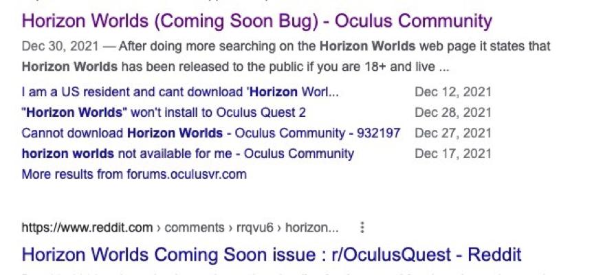 虽然装备已准备齐全,但真正进入Horizon Worlds的过程却小插曲不断。本来,在去年12月听说Meta正式官宣开放Horizon Worlds时硅星人就想第一时间来给大家做个测评,但从去年12月以来,硅星人的Oculus Store里它都处于“Coming soon”的状态。