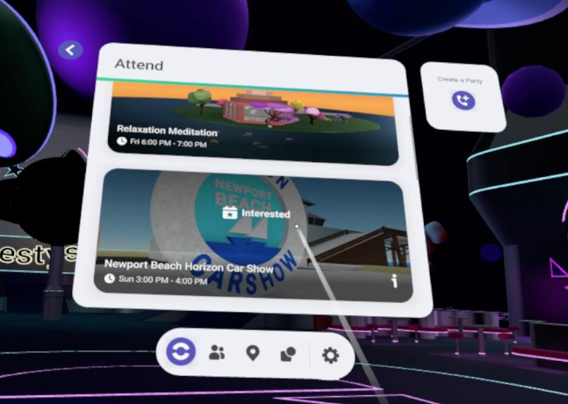 而除了Hangout之外,你还可以通过Attend里边的活动来找到兴趣相投的朋友。Attend里边的活动有固定的主题和固定的时间,你如果感兴趣可以点击订阅,活动开始前Horizon会给你发送提醒。目前的活动主题包括冥想、小组访谈、车展等等。