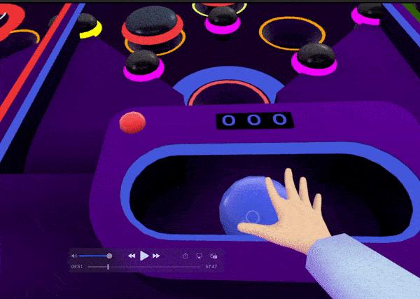 第一个小游戏,投球。就是抓球往洞里投,谁投进得多就得分多。用手柄模拟手指来抓取的灵活度还算不错,但向远处投掷的精准性却不太高,最后“逼得”硅星人只选择投面前最近的两个洞。