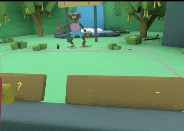 首先,平台上目前最受欢迎的游戏Arena clash。进入游戏后你可以先在等候区练习一下射靶,手柄模拟射击的操作还是比较灵敏的。接着,你就可以选择橙队或者蓝队开始“吃鸡”,几分钟的时间内,两队之中谁能把对方队员撂倒更多就获胜。