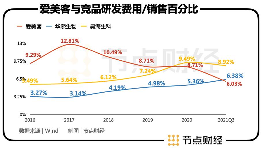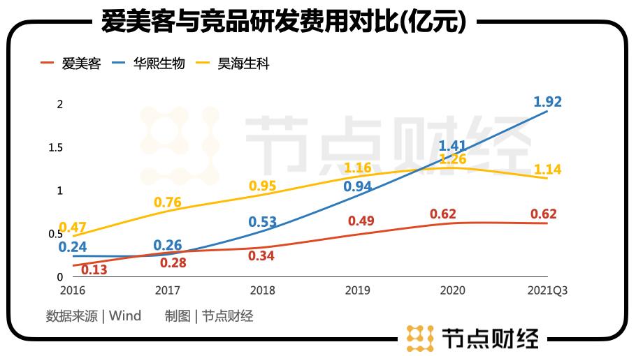 但对比来看,虽然爱美客研发费用在不断提升,比之五百多亿市值的华熙生物、一百多亿的昊海生科,似乎研发投入力度是最低的。