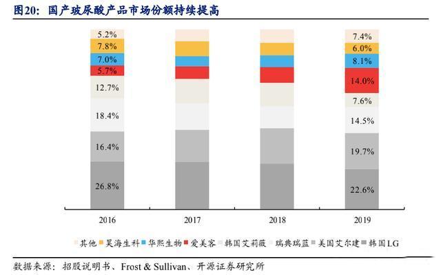 不断开辟新的市场。据弗若斯特沙利文研究报告统计,截至2020年,爱美客透明质酸钠类注射产品,按销售量计算的国内市场份额达到27.2%,排名第一;按金额(入院价)计算的国内市场份额已达到14.3%,在国产企业中排名第一,在所有国内及国际制造商中排名第三。