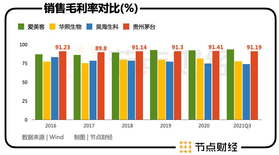 如图所示,爱美客的毛利率常年维持在85%以上,而且还有逐年提升的趋势,截至2021Q3,其销售毛利率已经达到93.54%。虽然整个医美行业普遍具有高毛利的特点,但我们可见华熙生物与昊海生科毛利率均维持在75%-80%左右,且昊海生科的毛利率还有下降趋势,截至2021Q3,华熙生物与昊海生科毛利率分别为77.79%、74.24%,远低于爱美客。