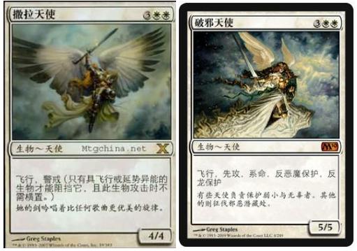 而万智牌又是发展的,一张牌现在强不代表永远强,在未来它很可能就被后辈取代。最直观的例子就是撒拉天使。这是一张白色代表生物,自Alpha版本就已经存在,前前后后印了至少23版,在万智牌上古时期它就代表着生物质量的天花板。但伴随着万智牌发展,撒拉天使的强度终于是被落下了,无法与之后的生物相抗衡,并最终在M10版本从金降格为了银,而其单卡价格除了具有收藏价值的版本外统统进了下水道。