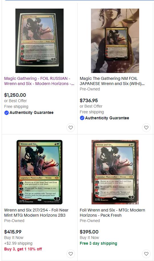 再然后是语言。一张万智牌的语言和其印刷地有关,受此影响不同语言版本的卡牌质量并不一致,且由于出货量原因,不同语言版本的印刷量也不同。语言对价格的影响颇为复杂,甚至有些玄学。例如英语牌的价格由于数量众多所以最为便宜,日文由于质量更好通常会比较贵,而在其他小语种里,俄语和韩语价格往往会高上一些,但意大利语却由于某些我不知道的原因比较便宜。这种差异同样体现在闪卡之上,高贵俄文闪与韩文闪的价格鹤立鸡群,日文闪价格坚挺,英文闪就不怎么受重视了。