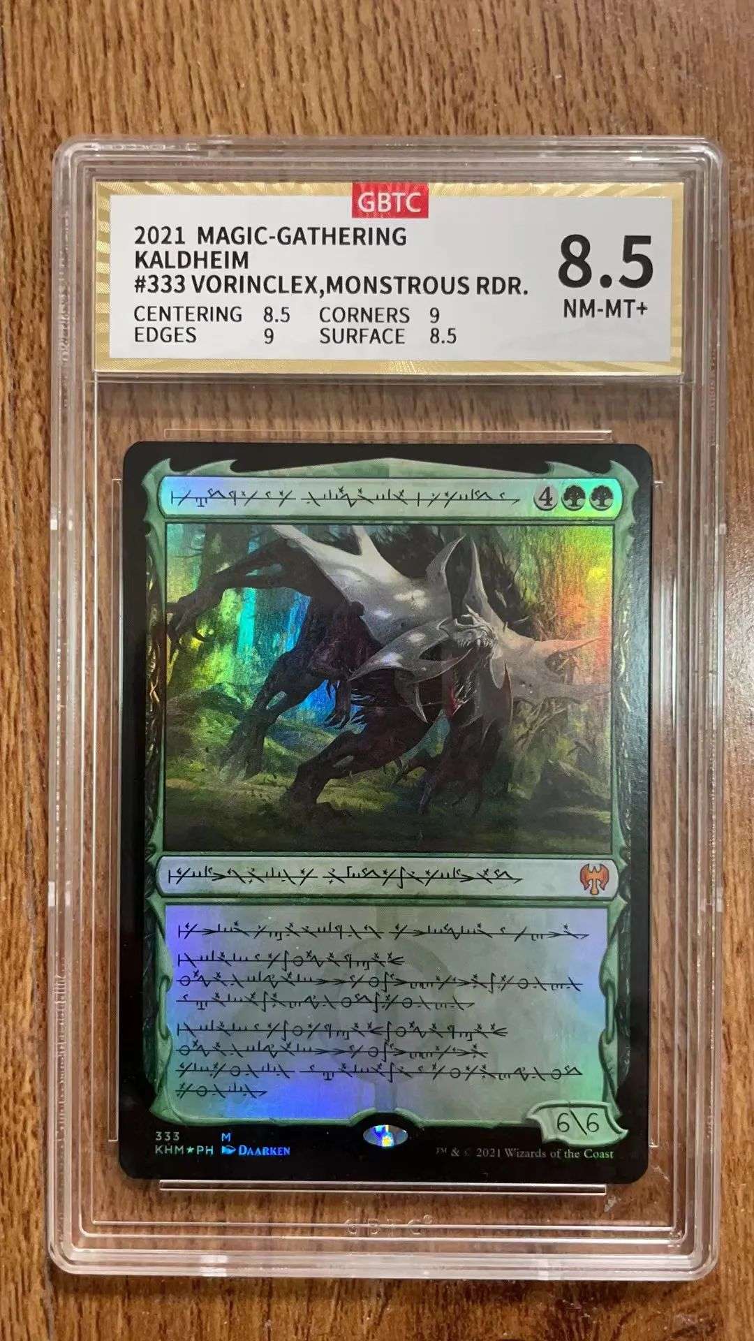这一点对于高价卡、限量单卡以及以收藏为主的单卡尤其重要,轻微受损就可能让一张牌的价格打个八折,所以如何鉴定单卡就是一门很深奥的学问。反正我是真的不会,比如这张8.5评分的单卡我就不知道问题在哪儿。