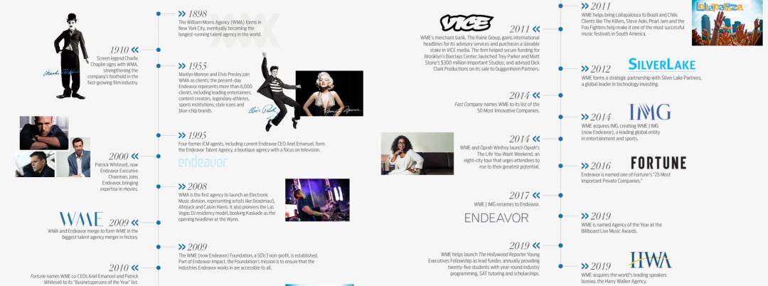 冰雪盛会的成功让这家冰山之下的巨头第一次出现在中国大众的视野前,但事实上,追溯Endeavor的公司发展脉络,可以回探到1898年成立的William Morris Agency(WMA),这是美国艺人经纪公司鼻祖一般的存在。