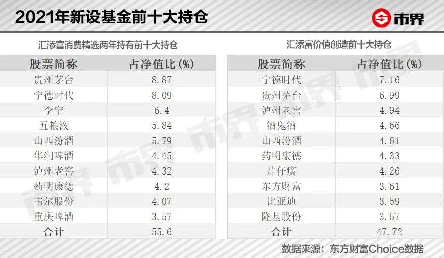 2021年末,胡昕炜新发的三只基金中,非传统消费股的占比较高。新发基金的前十大重仓股中,宁德时代、药明康德、东方财富、比亚迪、隆基股份均为近半年以来胡昕炜的新选择。