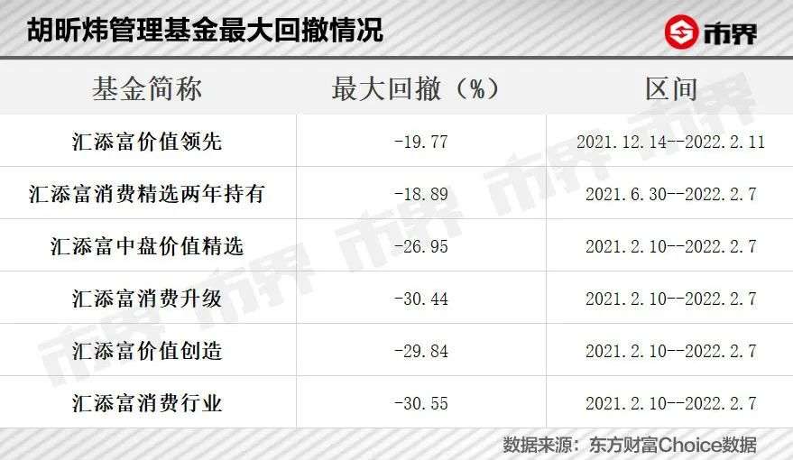 2021年2月10日以来,胡昕炜管理的基金净值持续回撤。2021年2月10日至2022年2月8日,其代表基金汇添富消费行业回撤达到30.55%,是自胡昕炜接手以来的最大回撤,其他基金也未能幸免。
