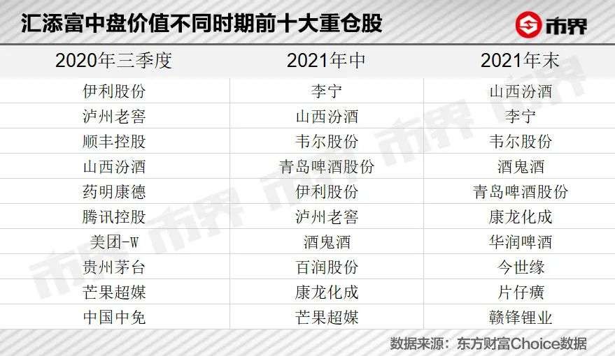 2021年3月9日,汇添富中盘价值较前期高点回调25.98%。净值大幅下跌致使胡昕炜对该基金进行“大换血”。