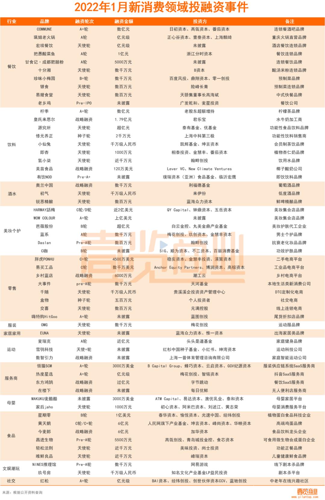 备注:融资以品牌或媒体披露时间为主,涉及多个赛道的首选品牌/企业的主营业务。对于向市场公开金额的融资,计算中用实际数字。对于没有公开的金额融资,部分融资额数据为估算值,计算方法如下:数十万=50万;数百万=300万;数千万=3000万;数亿=30000万;近亿及亿元=10000万;千万级=1000万;百万级=100万。外币经过换算,未披露融资金额暂不计入。