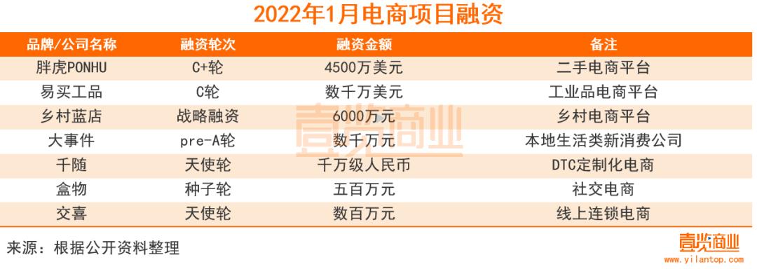 整体来看,电商是1月增长最快的赛道,据《壹览商业》统计数据显示,1月共有7个电商项目获得融资,融资金额为5.88亿元。