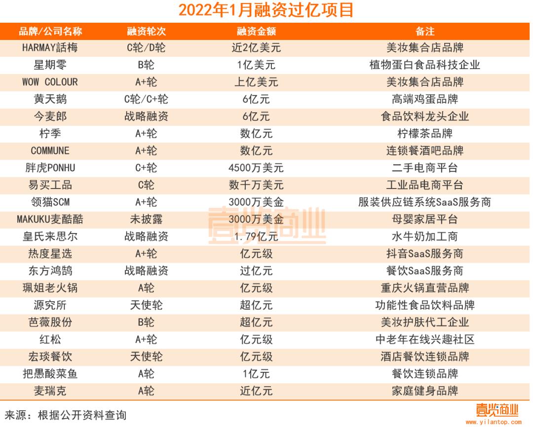 美妆集合店品牌HARMAY話梅完成近2亿美元C轮及D轮融资,融资金额为1月之最。据天眼查数据显示,自成立以来,HARMAY話梅共完成4轮融资,先后吸引了多家一线投资机构。本轮融资完成后,HARMAY話梅的估值将进一步提升,或超过100亿元。
