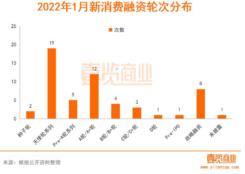 从融资轮次来看,1月新消费品牌的融资主要集中在早期阶段,发生在B轮及以前的融资占比为68%。其中天使轮阶段最多,共发生19起,其次A轮系列12起,另有8起战略融资。