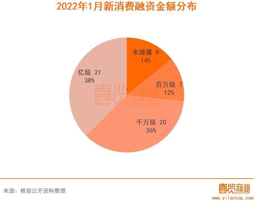 从融资金额来看,与去年每月融资金额主要分布在千万级别不同,今年1月的融资金额主要以亿元级为主。56起融资中,有21个品牌获得亿元级别融资,融资金额为63.03亿元,占总融资金额的90%以上。获千万级融资的品牌有20个,融资金额为4.85亿元。获百万级的品牌有7个,融资金额仅为0.28亿元。