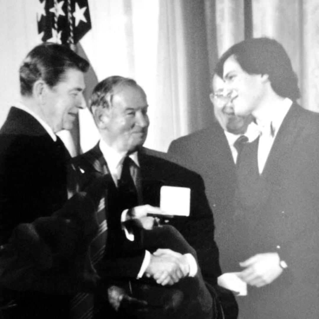 里根在白宫与乔布斯以及其他创业者会面。一向藐视权威的乔布斯竟然没有拒绝这次会面的请求,并且在总统先生面前显得毕恭毕敬,很有礼貌