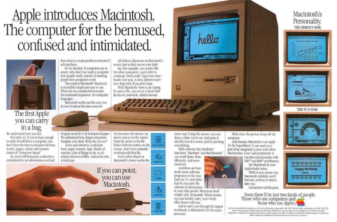 在大部分电脑史学家眼中,苹果在 1984 年 1 月发布的 Macintosh 128k 在计算机史中具有举足轻重的递费。与使用 DOS 命令行的 IBM PC 不一样,苹果的 Macintosh 据称是世界上第一个采用图形用户界面的个人电脑。