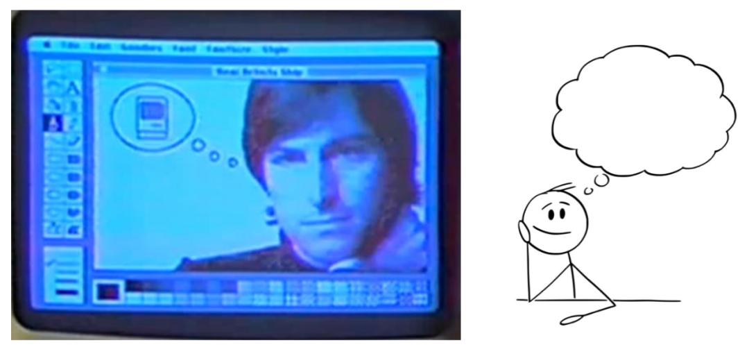 在乔布斯的旁边有一个漫画里常出现的气泡对话框,里面装着一个Macintosh 128k的emoji。在当时的漫画中,断续的气泡一般都是内心思考。这图像想传递的信息就是Macintosh 128k是乔布斯这个“发明家”构想出来的,即使这一观点并不成立。