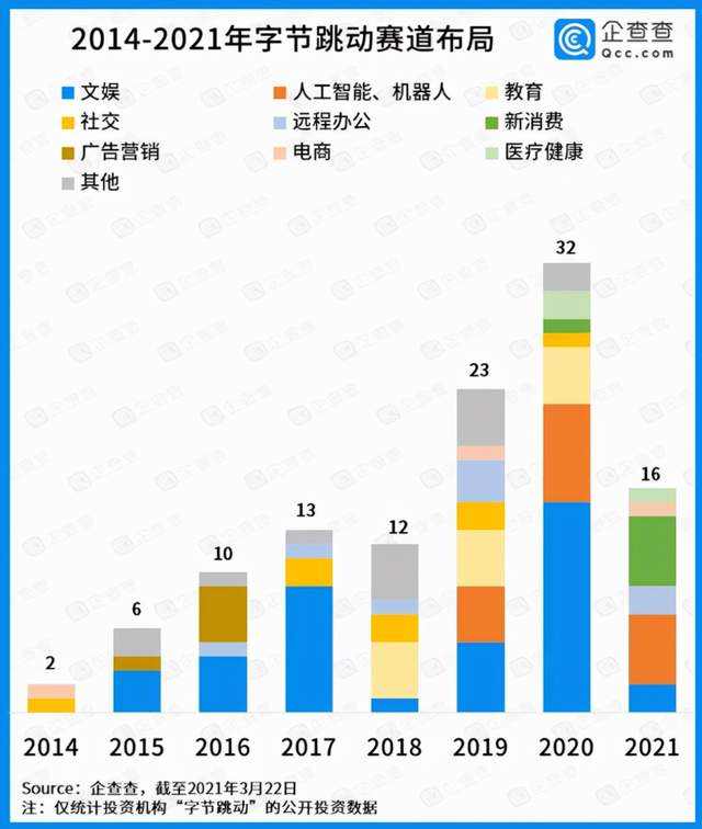 据企查查数据研究院整理发布的“字节跳动商业版图”显示,目前字节已经在资讯、长短视频、游戏、教育、社交等赛道布局。