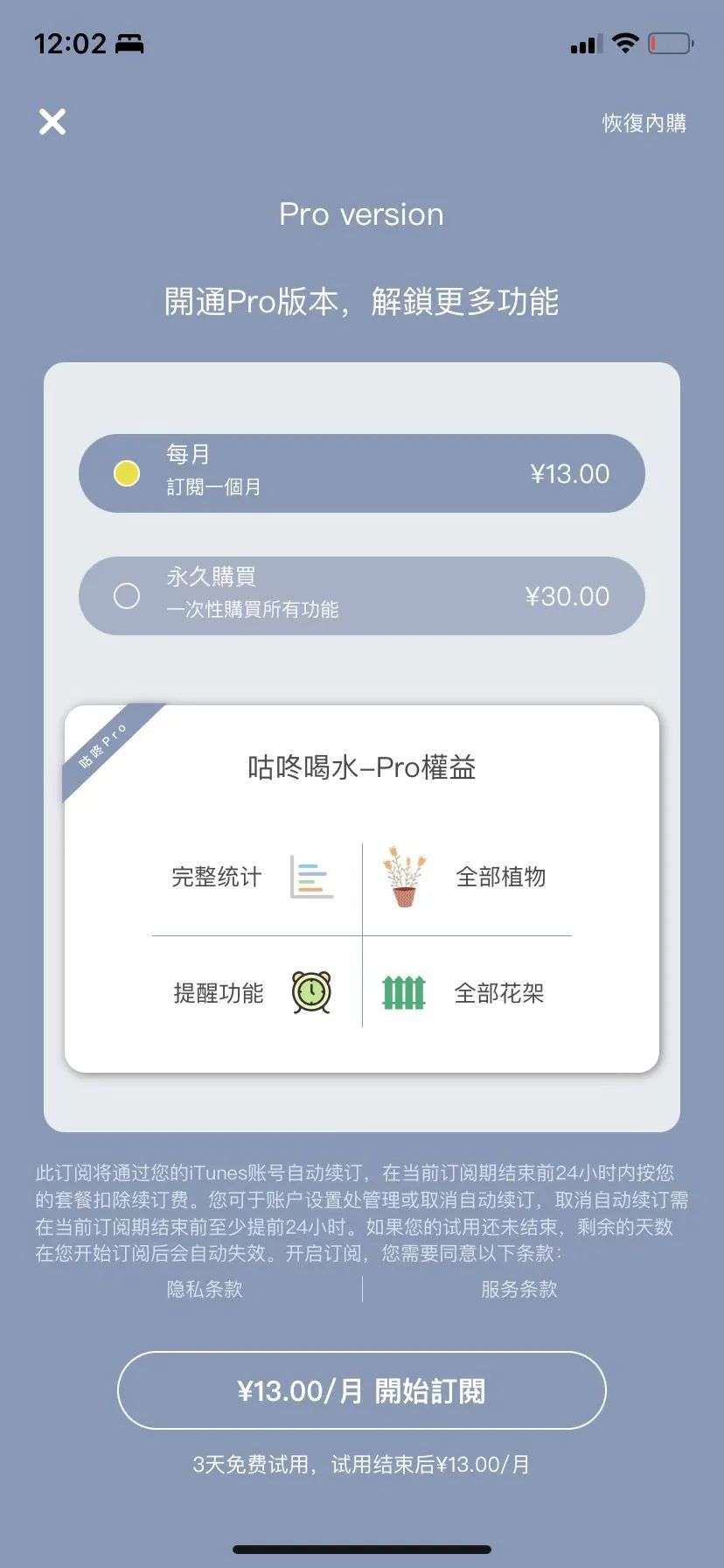 不过在定时提醒方面,这款APP就开始嘎我韭菜了!如果想要使用这款APP的提醒功能就的每月花13块钱升级订阅这个APP。
