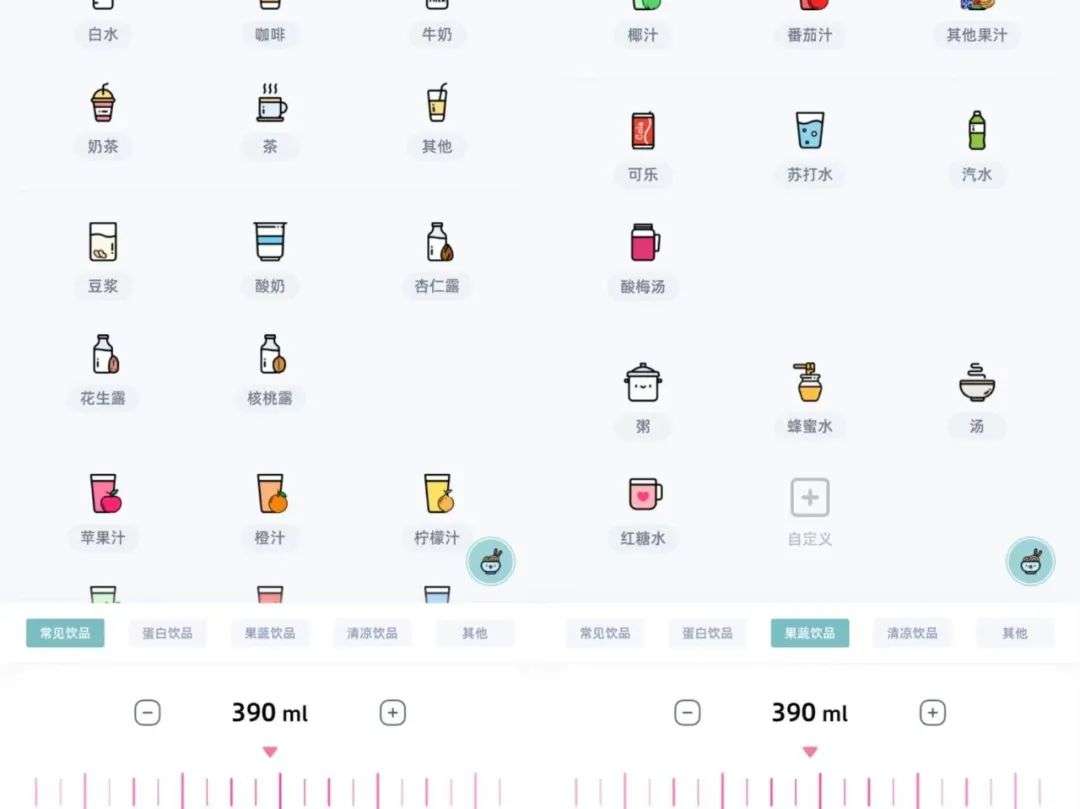 柠檬喝水在记录和提醒两个基本需求上做的都挺好。打开页面设定好每日喝水目标之后,下边还有各种饮品类型可以细分记录各个饮料的容量和带来的卡路里。