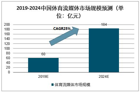 短视频时代,体育赛事的话题热度爆炸式增长,根据相关机构预测,到2024年我国体育流媒体市场规模达到184亿元,以2019年60亿元市场规模为基础,5年CAGR达到25%,未来5年将保持高速增长状态。