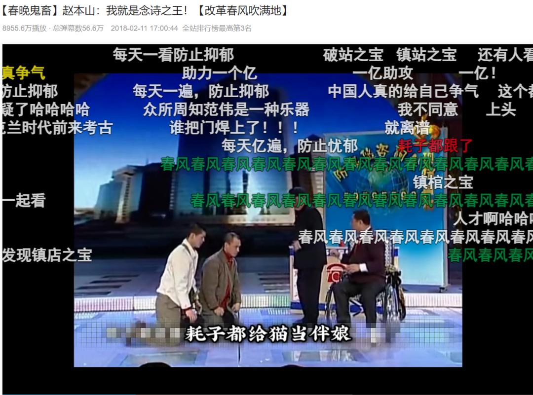 在稳固的创作者和视频系列的同时,2018年的鬼畜区也迎来了其史上最大的爆款,《赵本山:我就是念诗之王》。该视频目前在B站播放量高达8900万,位居B站历史最高播放量视频第三名。B站之外,念诗之王也火到了新兴平台抖音快手上,更是与其前辈一样,让赵本山本人知道了这首鬼畜的存在。