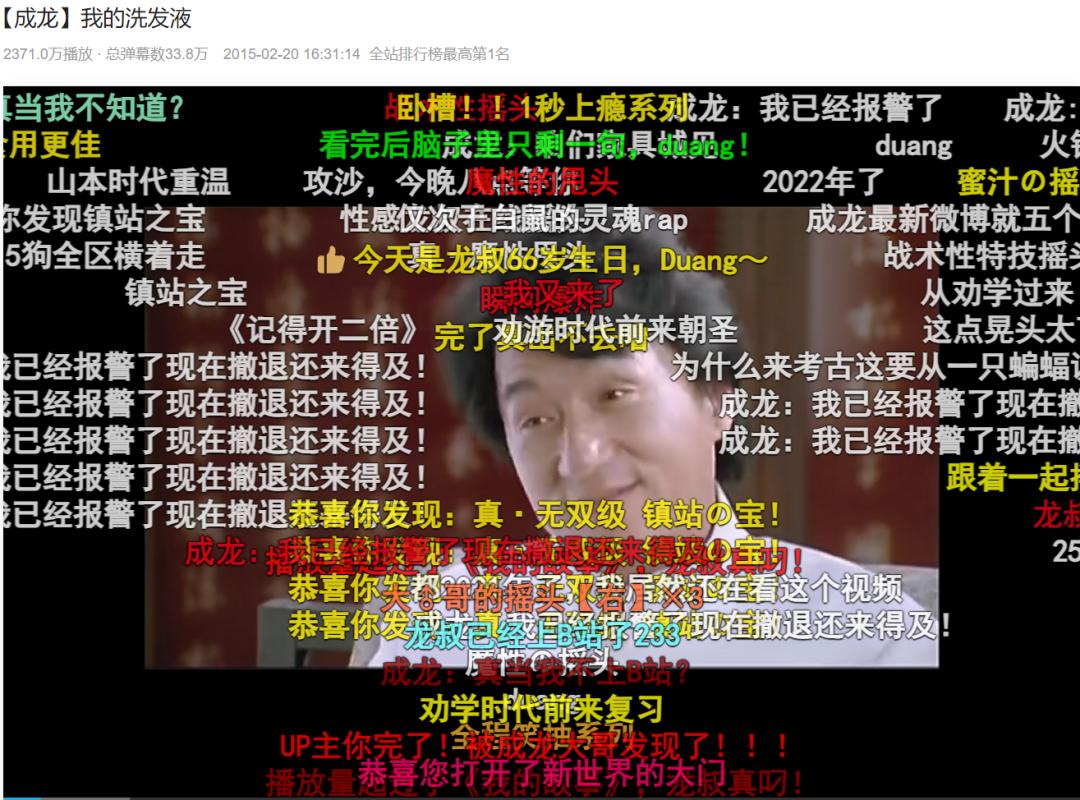 2015年,成龙的洗发水广告一度引起争议,UP主“绯色toy”抓住了其解释广告时的喜感台词,并套用当时的网络神曲“我的滑板鞋”,将其变成了一首朗朗上口的“我的洗发液”。神曲+爆梗,成龙的鬼畜迅速火爆了中文互联网,甚至惊动了成龙本人,在一档综艺节目中,成龙表示,以后都不敢再说“Duang”这个字了。