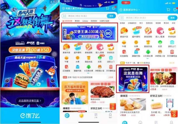 线上,借势《这!就是街舞4》开展两次“超级品牌日”合作,并通过饿了么开屏、首页banner、平台二楼创意互动等方式激活用户消费心智;线下与汉堡王、小龙坎、西部马华、避风塘四大快餐龙头形成异业合作,通过IP主题门店、定制套餐(如携手汉堡王上线“街舞联名套餐”)等营销动作吸引粉丝进店消费,加大品牌曝光和佐餐场景深化。