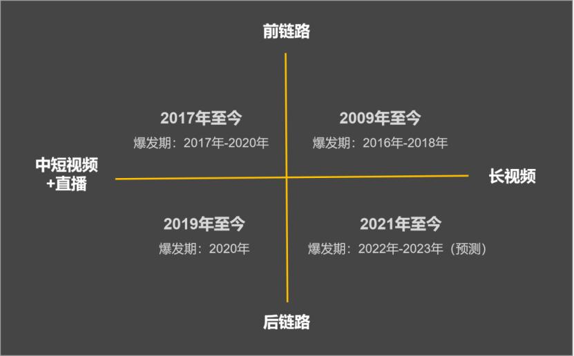 “视频+链路”两大生态系统间整合化反,成为了近几年内容营销的兴奋地带。长短视频、前后链路,构成了内容营销的“四大象限”。