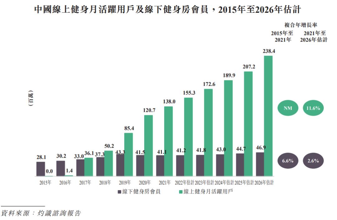 毕竟,线上健身市场规模仍处于高速发展时期。根据灼识咨询报告,中国的线上健身市场于2021年达到人民币3701亿元,预计2026年将增至人民币8958亿元,复合年增长率为19.3%甚至报告还认为中国健身市场的未来增长将主要归因于中国的线上健身市场。根据灼识咨询报告,2021年中国线上健身市场占中国整体健身市场的47.0%,预计2026年将占60.6%。