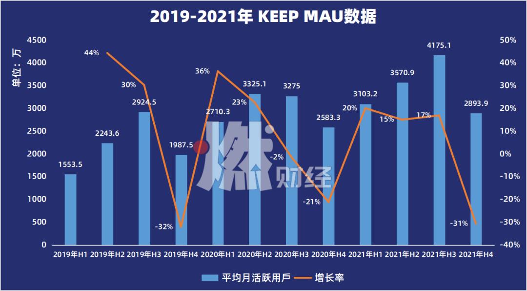 从下图能清晰看出,整个2019年Keep的MAU数据都在往上涨,但在2019年第三季度后数据来时回落。2020年初,因疫情这一黑天鹅事件影响,Keep彻底扭转了局面,MAU数据走出了一个“深V型”折线,但从2021年全年数据来看,虽有增长,但增长依旧处于较平缓状态。