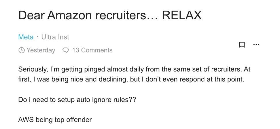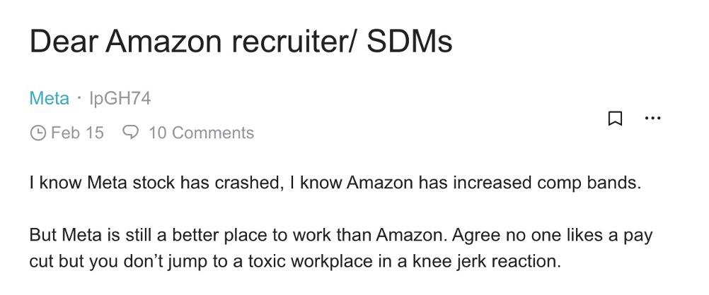 这在人家伤口上撒盐的操作让人看了直呼内行,气得一些Meta工程师在Blind上发帖喊话亚马逊的猎头们停止这种操作,表示Meta跌得再怎么惨自己也不可能愿意去亚马逊工作。