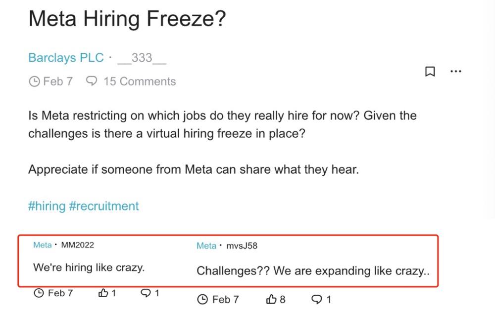 在Meta最近股价大跌之后,最近有程序员在Blind上提问,想知道Meta的招聘计划会不会因为受公司业务的影响而停滞,而下边一众来自Meta的员工都回复说:“停滞?我们公司最近正在像疯了一样的招人。”