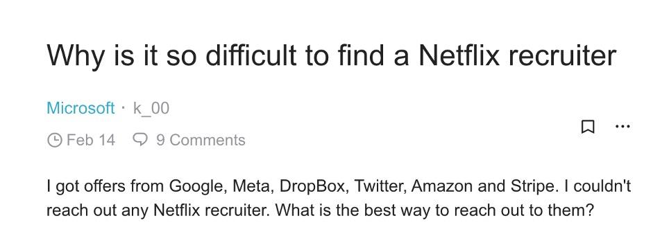 如果说有些大厂的猎头求职者还能找的到、还能有机会被他们“撩”,那像Netflix这种直接就能给你几十万美元基本工资的公司猎头,则是求职者们需要努力“巴结”的对象。他们的身影不仅难找,而且就算找到了也几乎是无济于事。