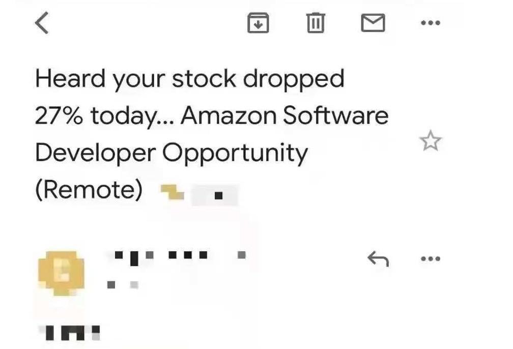 比如,一些猎头们紧追时事,当发现上一季度Meta财报后崩了之后,便第一时间打开电脑群发邮件给Meta的员工们,并附上了一个又损又扎眼的标题:“听说你们家股票今天跌了27%呀...要不看看咱亚马逊的职位吧”。