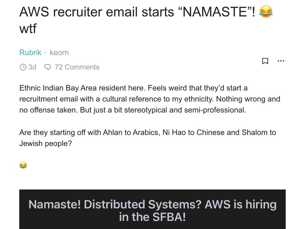 最近,一些猎头还将“看人下菜”这件事发挥得更加游刃有余。 比如, 有位印度裔的工程师就发文表示,他收到了来自亚马逊猎头用印度语“Namaste(你好)”为开头标题的邮件。 他好笑又无语地问现在猎头们都开始从种族下手了吗,有没有中国工程师收到过“Ni hao”作为开头的邮件?