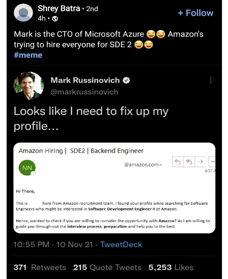 去年年底,微软云Azure的 CTO Mark Russinovich曾发布了一个推文,贴了一张关于亚马逊的猎头给他发邮件的截图,里面问他对亚马逊的SDE 2的工作是否感兴趣,并啼笑皆非地配文称自己是不是该改改简历了。