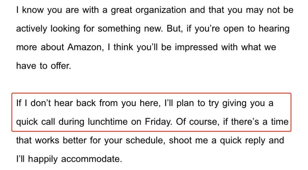 比如一位工程师给硅星人提供的了他的一封邮件截图,在他一直没有回复一位亚马逊的猎头之后,那位猎头给他发了一封邮件并在文末说道:“如果你不回复我的话,我决定周五中午给你打电话。”注意,这里用的是陈述句,而不是请求问句。逼得这位工程师不得不马上提笔写邮件拒绝。