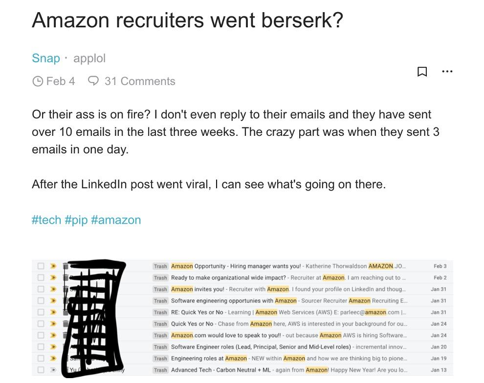 浏览一下工程师们爱逛的论坛,你会发现,对于亚马逊家的猎头,大家的一致感受就是他们发邮件的频率真的是太高了!打开邮箱,所有猎头的邮件中,来自亚马逊的几乎占据一半以上,而且是那种每天都有不同的猎头给你发,甚至一天有好几个猎头同时给你发那种。感觉他们全员贯彻了“宁可错发三千,不肯放过一个”的指导精神。