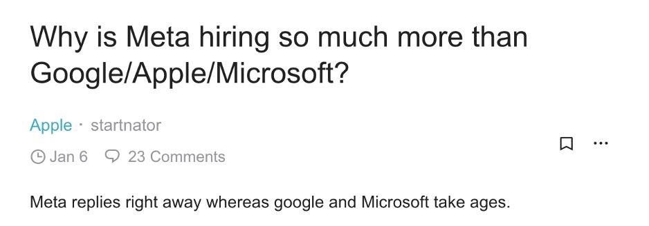 很多工程师可能一天能收到几封来自亚马逊和Meta猎头的邮件,但可能一两年才能收到一封来自谷歌或者苹果猎头的邮件。有工程师在论坛上表示,Meta的猎头们往往回消息都很快,但微软和谷歌的猎头们却总要花上很长的时间。