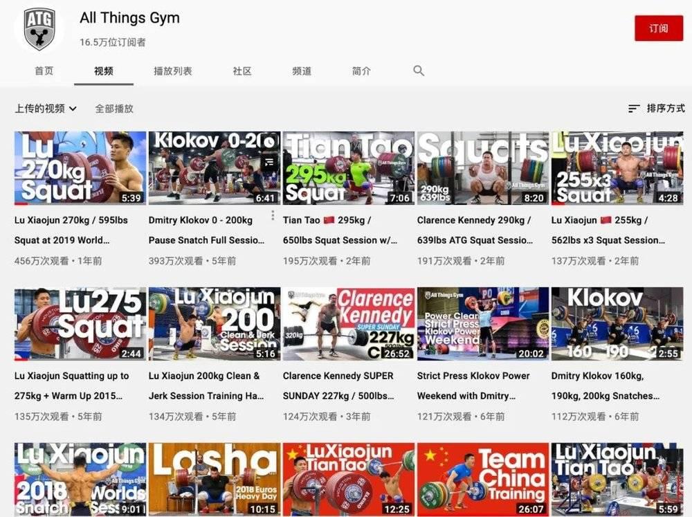 YouTube上一个叫做“All Things Gym”的举重健身自媒体,日常专注于发布世界各地举重健身达人的训练视频剪辑。吕小军的训练视频是帐号的流量密码,一半以上的视频是他日常训练。