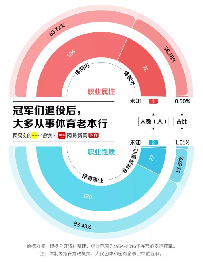 在已退役的 199 名冠军中,有 63.32% 的人进入了体制内,并且,还有更多的人回到了自己的老本行,干起了熟悉的体育事业,占比 85.43%。