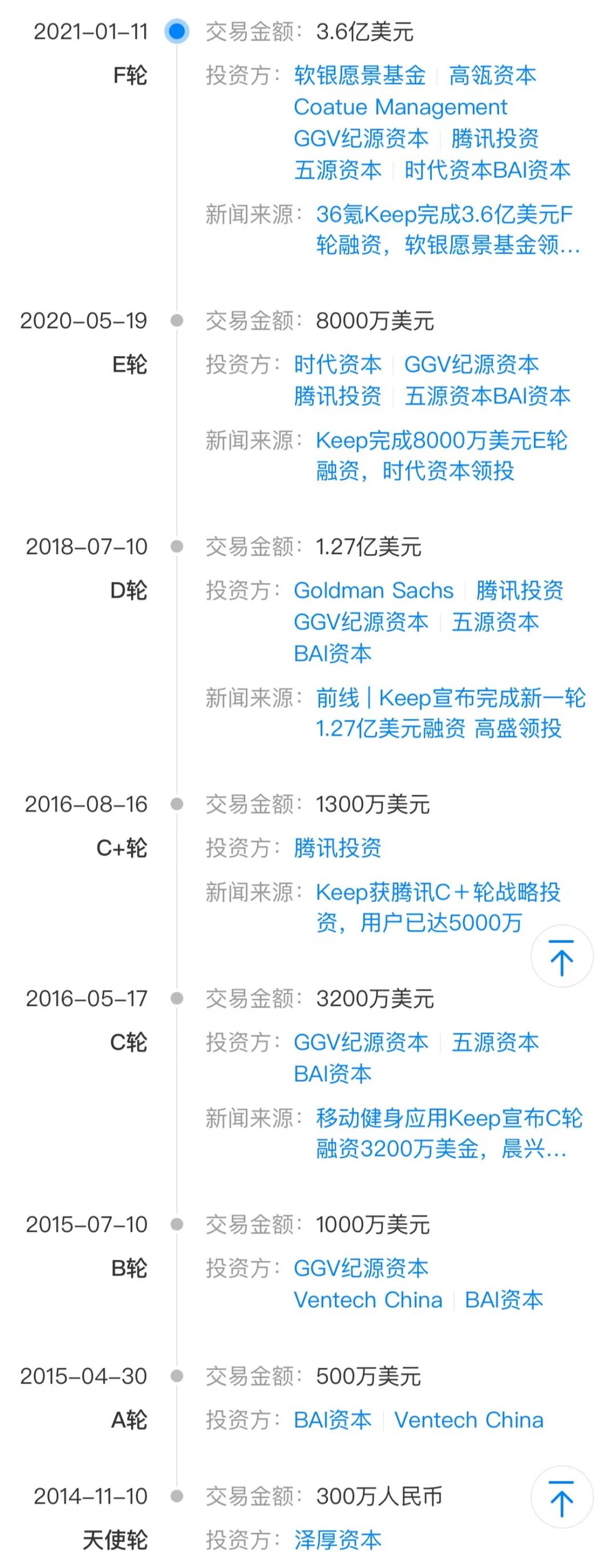 Keep最新一轮融资是于2021年1月宣布完成的3.6亿美元F轮融资,由软银愿景基金领投,高瓴资本、高都资本跟投,GGV纪源资本、腾讯、五源资本 (原晨兴资本) 、时代资本以及BAI资本等老股东继续追加投资。此轮融资后,Keep的估值翻了一倍,达到20亿美元。