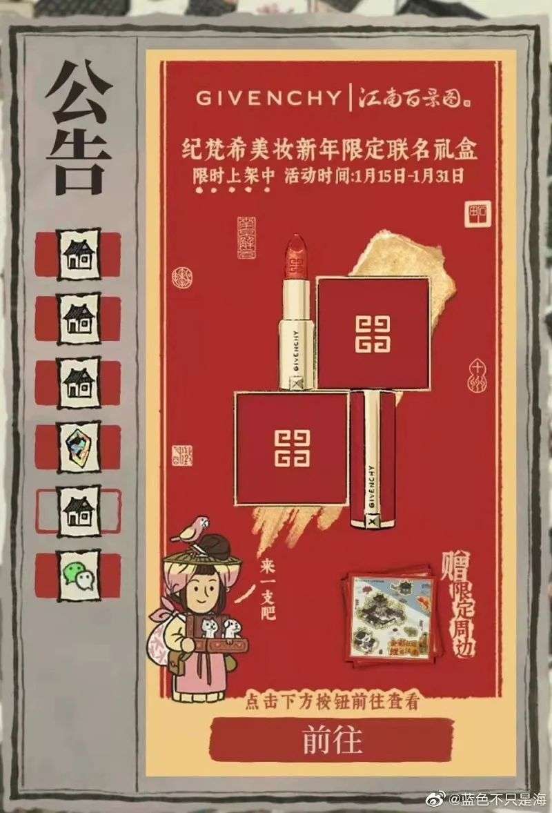 去年1月,纪梵希和手游《江南百景图》展开合作,游戏内阿鹦小铺上线了联名公告,并可以在游戏内直接跳转至购买页面;同时联名礼盒内还有限定贴纸以及游戏礼包兑换码,玩家购买联名产品后,即可通过兑换码换取对应的游戏礼包。