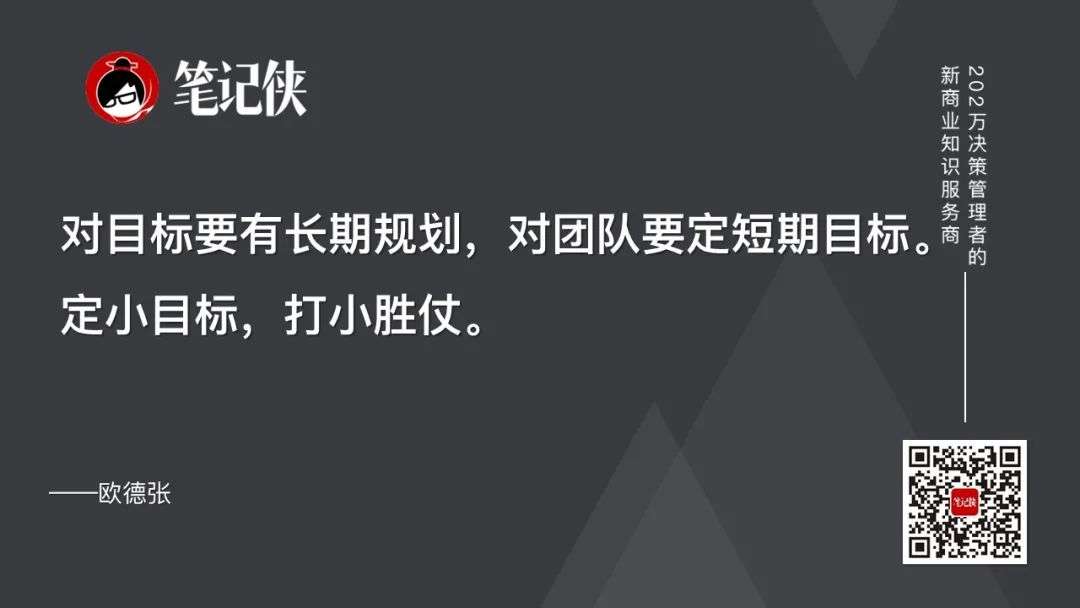 对目标要有长期规划,对团队要定短期目标。定小目标,打小胜仗。
