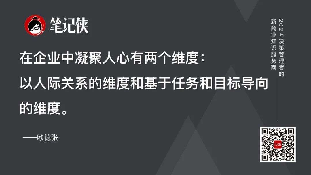 在企业中凝聚人心有两个维度:以人际关系的维度和基于任务和目标导向的维度。