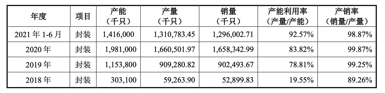 如今,随着国内经济活动步入正轨,甬矽电子的产能利用率持续攀升,其产能已处于较为饱和状态。其中在2021年上半年,公司产能为14.16亿只,销量为12.96亿只,产能利用率达92.57%,产销率达98.87%。