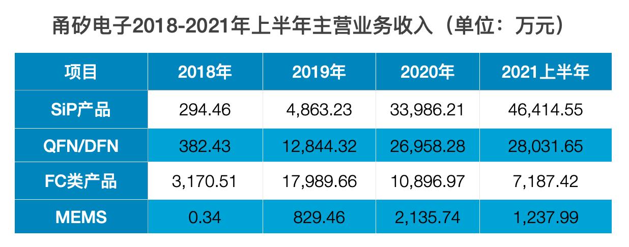 甬矽电子2018-2021年上半年主营业务收入(单位:万元)